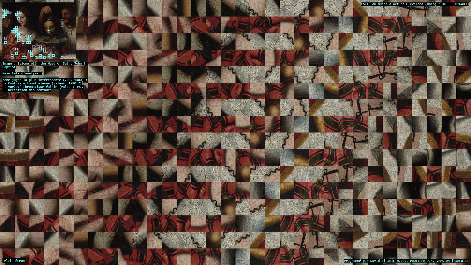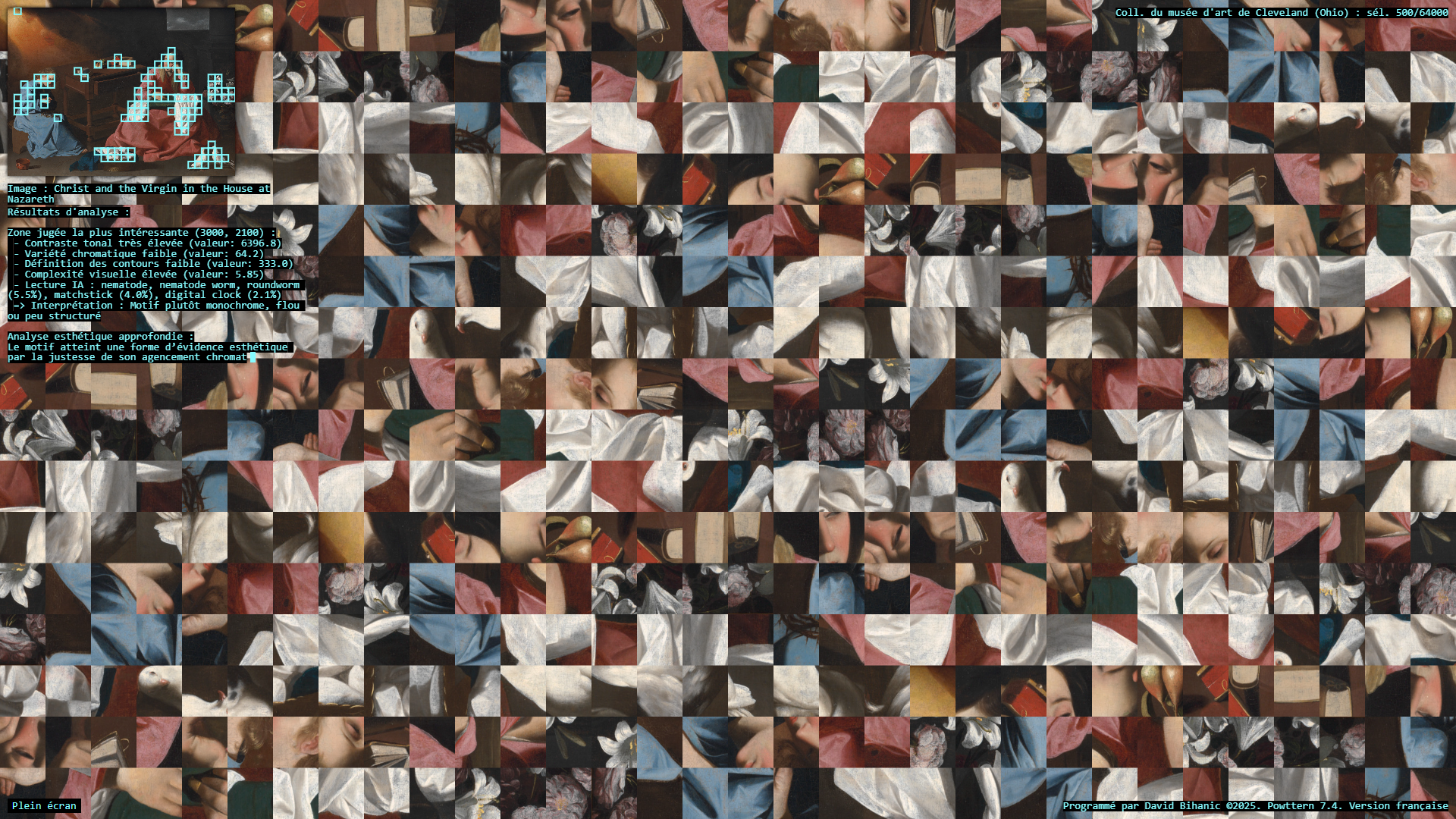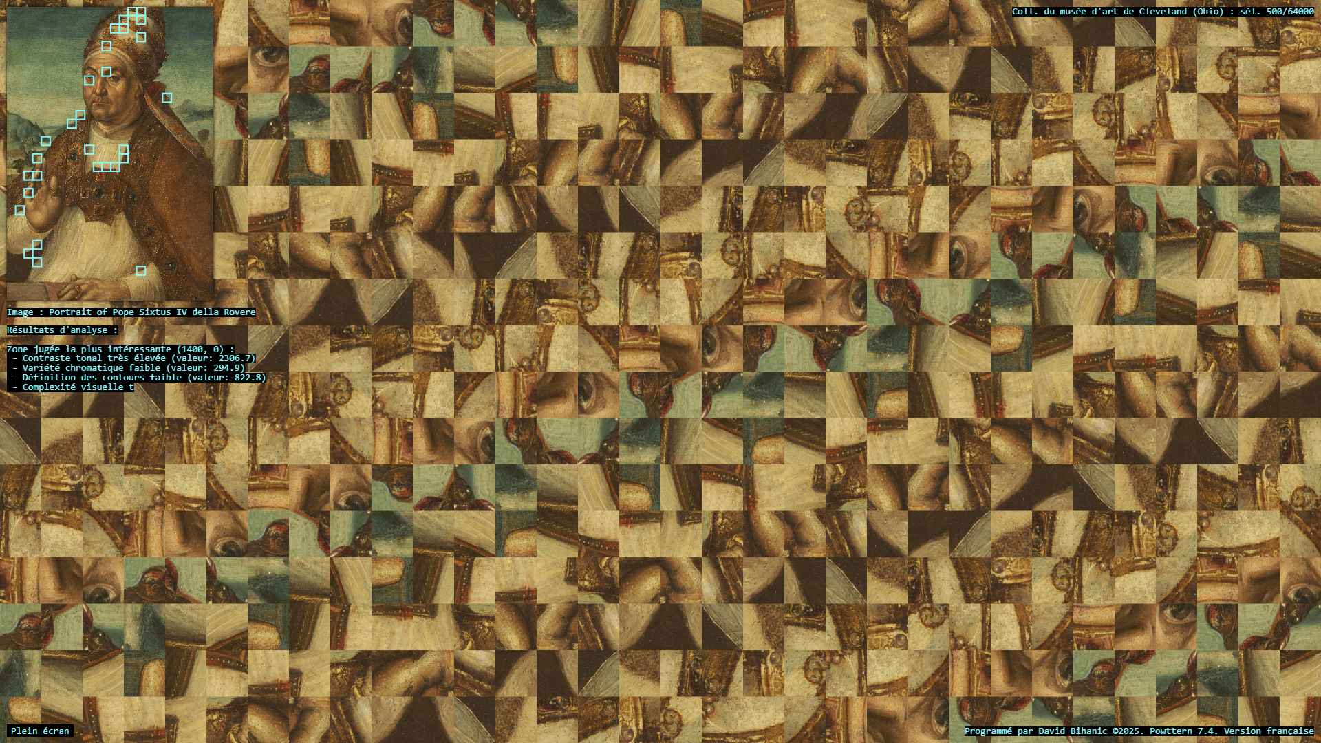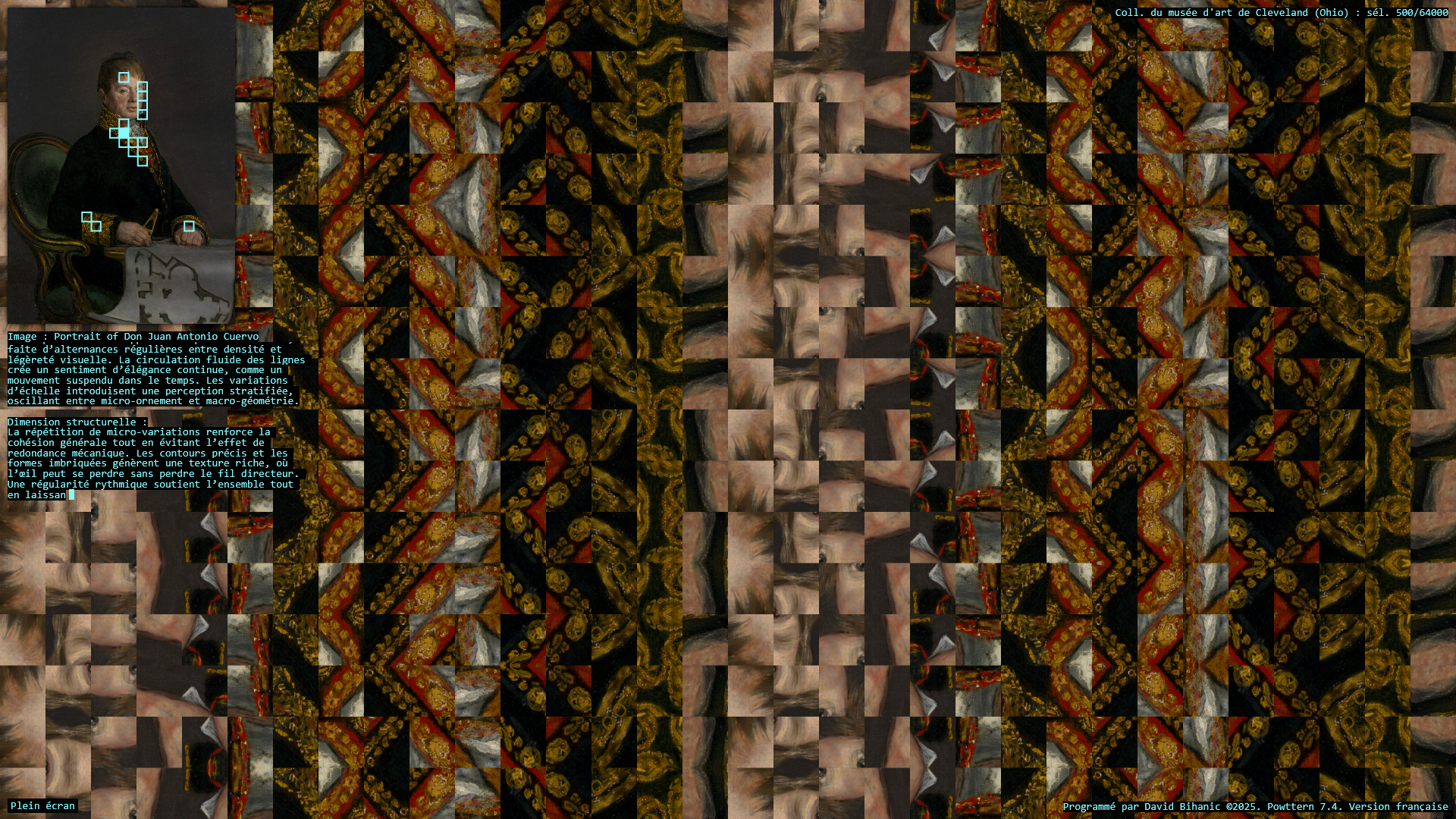 The act of ornamenting (from the Latin ornare) is, in many ways, inseparable from the exercise of power, a practice that carries with it political, ideological, cultural, and social implications. Plutarch recounts in the Life of Pericles (c. 100–120 CE) how Pericles, empowered by his role as a leading military strategist , used the spoils taken from subjugated cities to adorn the city of Athens: [Plutarch quoting Pericles] “(…) we gild and embellish our city, like a coquettish woman, decking her with precious stones, statues, and temples worth a thousand talents.” Centuries later, Augustus, as emperor of Rome, turned the richly (even ostentatiously) decorated Ara Pacis into a genuine instrument of propaganda, designed to enhance (or rather to restore) his prestige. In a similar vein, it is worth mentioning the decorum of palaces, from the Alhambra to Versailles, as a sign of majesty and power, the rise of Baroque ornament in the service of the Catholic Church and its “colonialism of faith,” and later the emergence of a modern, pared-down ornament—not entirely rejected or condemned (cf. Loos, Gropius, Le Corbusier), but rather reconfigured—all celebrated the advent of the machine age and industrial modernity, as Siegfried Kracauer so perceptively described in The Mass Ornament (1927). This raises a pressing question: what place does ornament occupy in our societies today? And what kind of relationship does it still maintain with power? The data art project Powttern (Power, Pattern) seeks to link these questions to those surrounding the current development of Artificial Intelligences (AI). What authority, what power, in the strictest sense, are we gradually (knowingly or unknowingly) ceding to these technologies and, in a broader sense, to computers, programs, and algorithms? And what if these new attributions were to extend not only to creation (to the autonomous generation of works combining forms, figures, and motifs) but also to aesthetic knowledge itself, to the very science of art?—thus endowing them with the power to ornament, that is, to decide (alone?) on new forms of “politics of ornament,” to borrow here an expression from Antoine Picon (cf. Ornament. The Politics of Architecture and Subjectivity, 2013). Powttern therefore presents itself as a provocation: it grants an original computer program, integrating neural networks (MobileNet, TensorFlow), the ability to analyze in real time a portion of the Cleveland Museum of Art’s collection (United States)—500 image-based works out of more than 64,000—in order to extract fragments deemed, by artificial vision, the most compelling, to derive from this material graphic motifs and ornamental compositions, and to articulate and justify its own choices. Suspended between fascination and disquiet, the resulting experience proves profoundly unsettling.