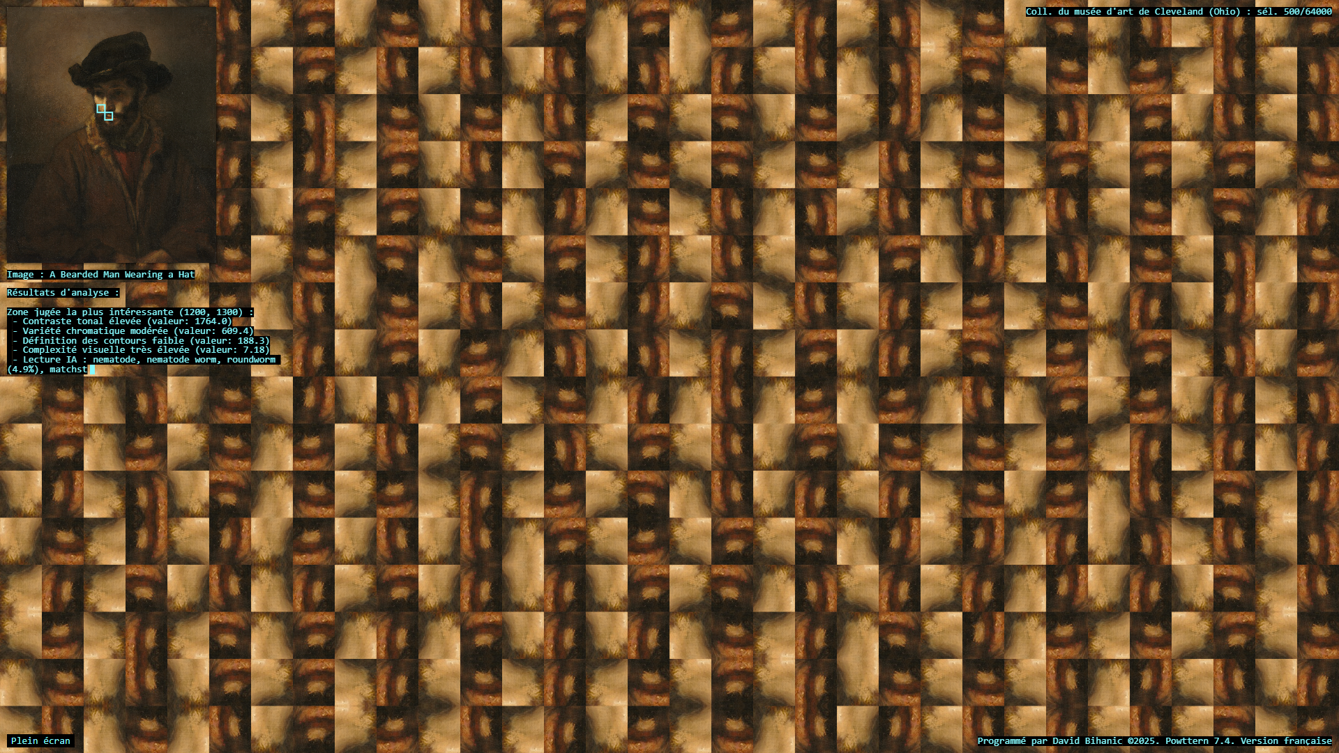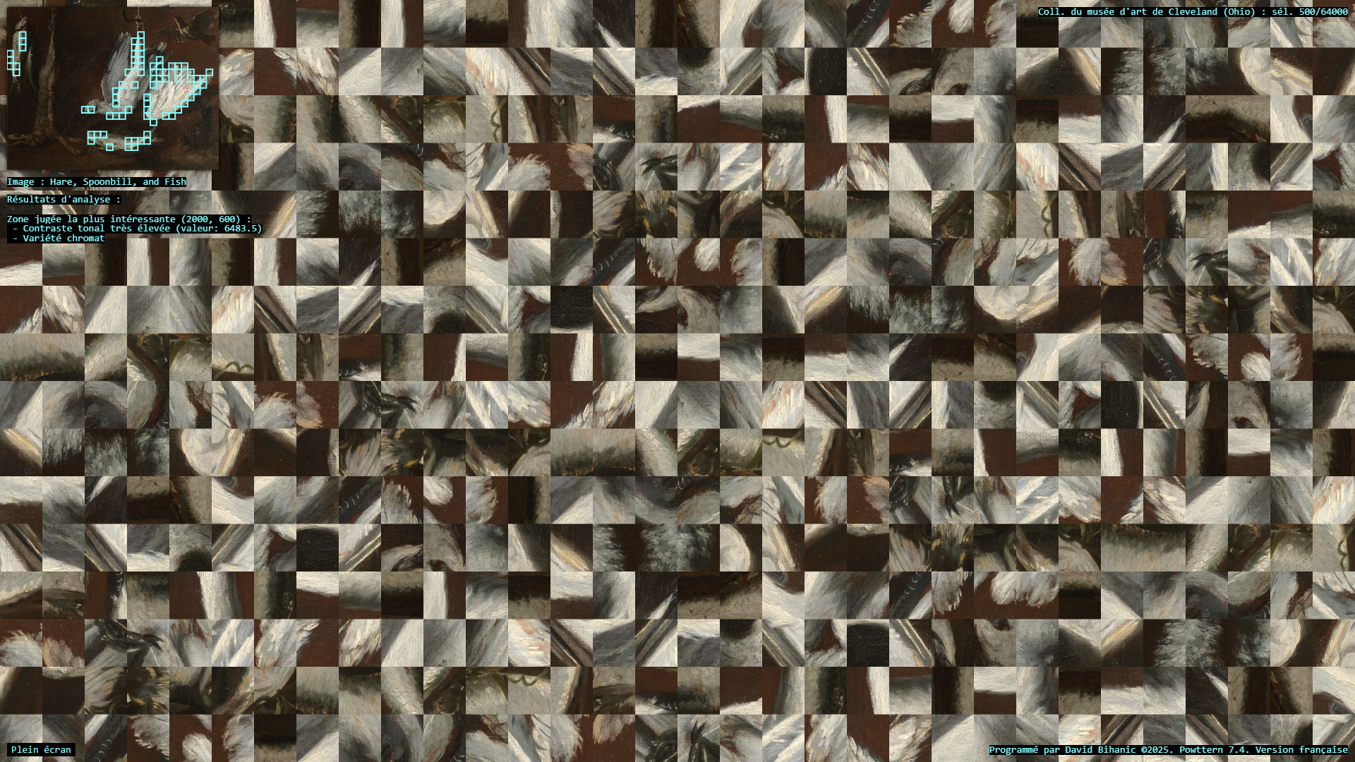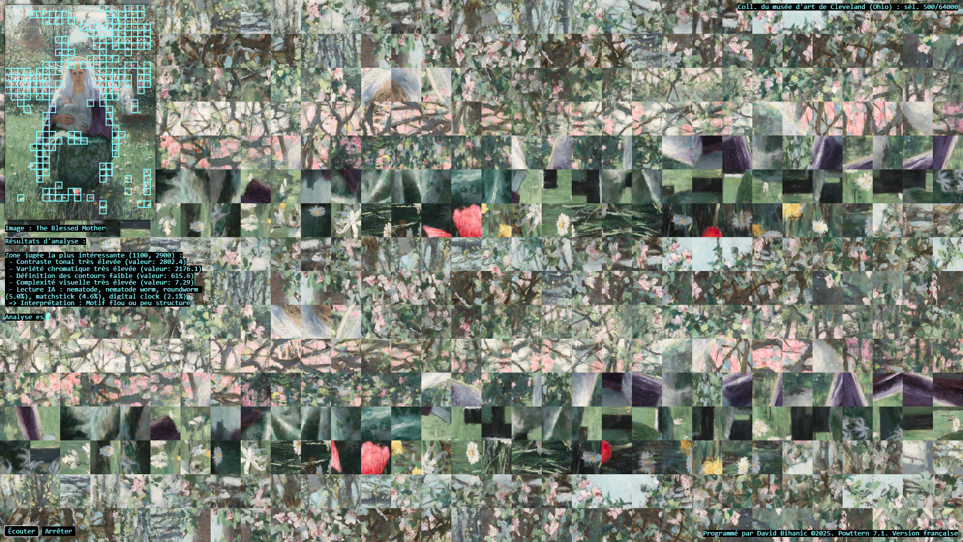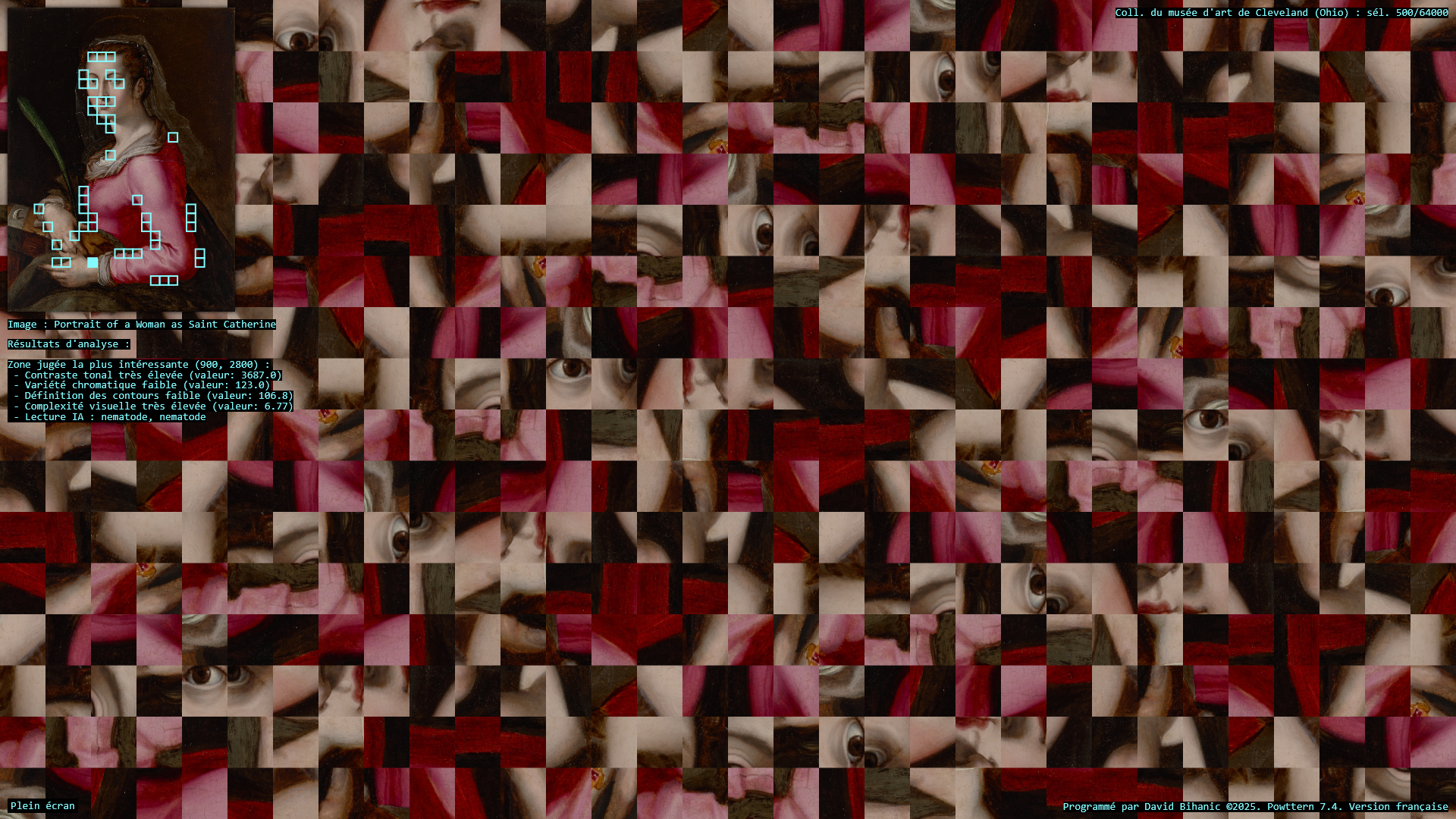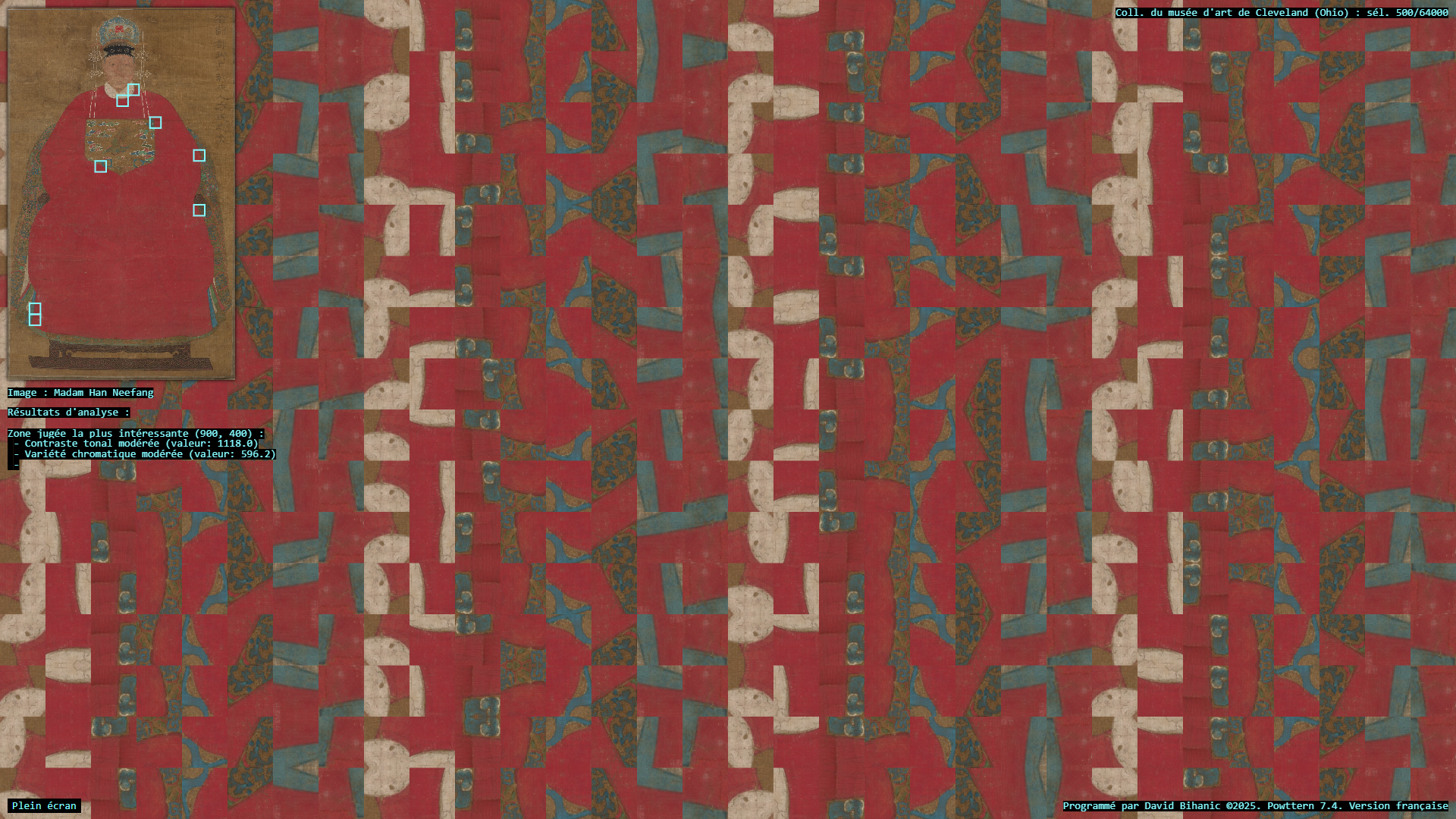 The act of ornamenting (from the Latin ornare) is, in many ways, inseparable from the exercise of power, a practice that carries with it political, ideological, cultural, and social implications. Plutarch recounts in the Life of Pericles (c. 100–120 CE) how Pericles, empowered by his role as a leading military strategist , used the spoils taken from subjugated cities to adorn the city of Athens: [Plutarch quoting Pericles] “(…) we gild and embellish our city, like a coquettish woman, decking her with precious stones, statues, and temples worth a thousand talents.” Centuries later, Augustus, as emperor of Rome, turned the richly (even ostentatiously) decorated Ara Pacis into a genuine instrument of propaganda, designed to enhance (or rather to restore) his prestige. In a similar vein, it is worth mentioning the decorum of palaces, from the Alhambra to Versailles, as a sign of majesty and power, the rise of Baroque ornament in the service of the Catholic Church and its “colonialism of faith,” and later the emergence of a modern, pared-down ornament—not entirely rejected or condemned (cf. Loos, Gropius, Le Corbusier), but rather reconfigured—all celebrated the advent of the machine age and industrial modernity, as Siegfried Kracauer so perceptively described in The Mass Ornament (1927). This raises a pressing question: what place does ornament occupy in our societies today? And what kind of relationship does it still maintain with power? The data art project Powttern (Power, Pattern) seeks to link these questions to those surrounding the current development of Artificial Intelligences (AI). What authority, what power, in the strictest sense, are we gradually (knowingly or unknowingly) ceding to these technologies and, in a broader sense, to computers, programs, and algorithms? And what if these new attributions were to extend not only to creation (to the autonomous generation of works combining forms, figures, and motifs) but also to aesthetic knowledge itself, to the very science of art?—thus endowing them with the power to ornament, that is, to decide (alone?) on new forms of “politics of ornament,” to borrow here an expression from Antoine Picon (cf. Ornament. The Politics of Architecture and Subjectivity, 2013). Powttern therefore presents itself as a provocation: it grants an original computer program, integrating neural networks (MobileNet, TensorFlow), the ability to analyze in real time a portion of the Cleveland Museum of Art’s collection (United States)—500 image-based works out of more than 64,000—in order to extract fragments deemed, by artificial vision, the most compelling, to derive from this material graphic motifs and ornamental compositions, and to articulate and justify its own choices. Suspended between fascination and disquiet, the resulting experience proves profoundly unsettling.