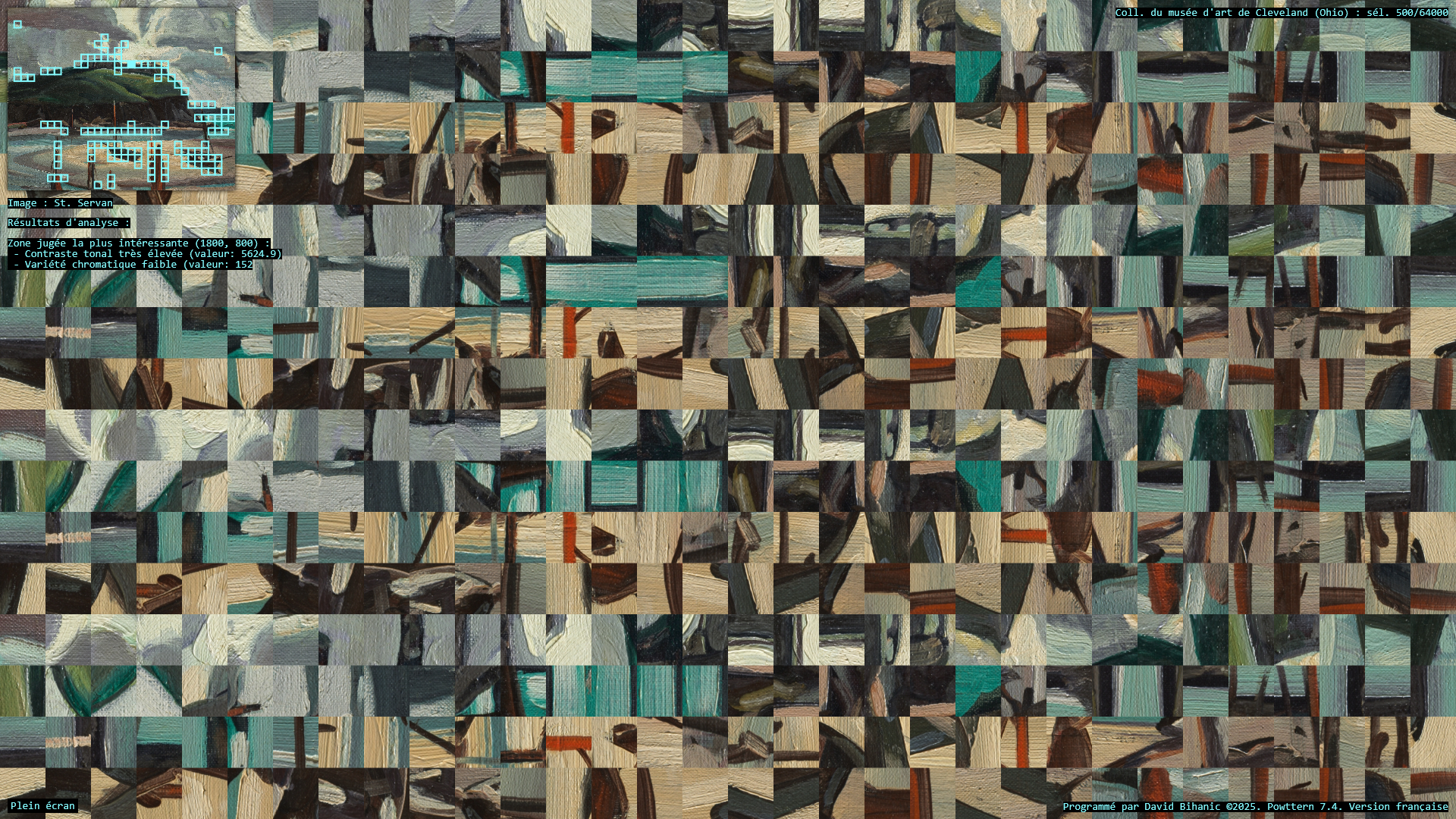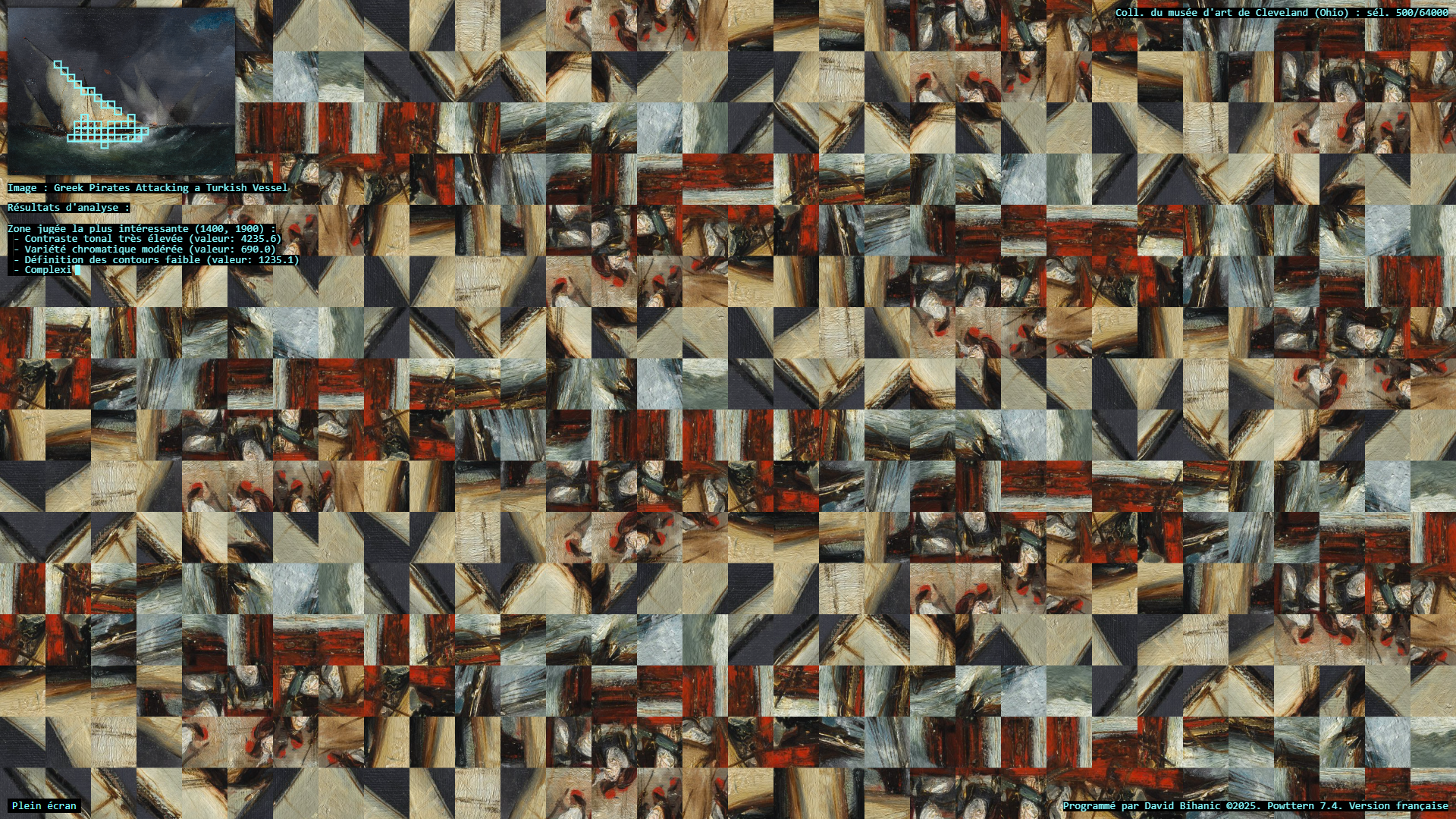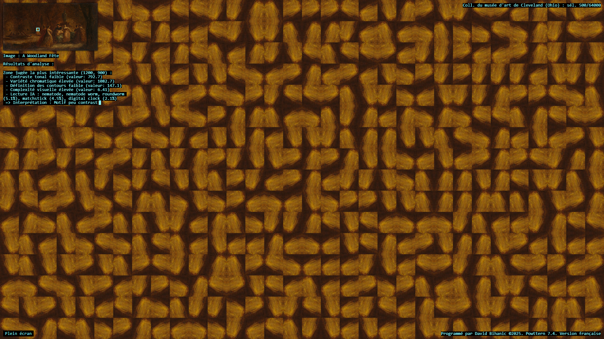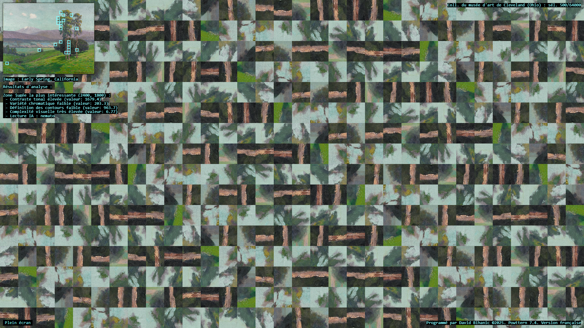 The act of ornamenting (from the Latin ornare) is, in many ways, inseparable from the exercise of power, a practice that carries with it political, ideological, cultural, and social implications. Plutarch recounts in the Life of Pericles (c. 100–120 CE) how Pericles, empowered by his role as a leading military strategist , used the spoils taken from subjugated cities to adorn the city of Athens: [Plutarch quoting Pericles] “(…) we gild and embellish our city, like a coquettish woman, decking her with precious stones, statues, and temples worth a thousand talents.” Centuries later, Augustus, as emperor of Rome, turned the richly (even ostentatiously) decorated Ara Pacis into a genuine instrument of propaganda, designed to enhance (or rather to restore) his prestige. In a similar vein, it is worth mentioning the decorum of palaces, from the Alhambra to Versailles, as a sign of majesty and power, the rise of Baroque ornament in the service of the Catholic Church and its “colonialism of faith,” and later the emergence of a modern, pared-down ornament—not entirely rejected or condemned (cf. Loos, Gropius, Le Corbusier), but rather reconfigured—all celebrated the advent of the machine age and industrial modernity, as Siegfried Kracauer so perceptively described in The Mass Ornament (1927). This raises a pressing question: what place does ornament occupy in our societies today? And what kind of relationship does it still maintain with power? The data art project Powttern (Power, Pattern) seeks to link these questions to those surrounding the current development of Artificial Intelligences (AI). What authority, what power, in the strictest sense, are we gradually (knowingly or unknowingly) ceding to these technologies and, in a broader sense, to computers, programs, and algorithms? And what if these new attributions were to extend not only to creation (to the autonomous generation of works combining forms, figures, and motifs) but also to aesthetic knowledge itself, to the very science of art?—thus endowing them with the power to ornament, that is, to decide (alone?) on new forms of “politics of ornament,” to borrow here an expression from Antoine Picon (cf. Ornament. The Politics of Architecture and Subjectivity, 2013). Powttern therefore presents itself as a provocation: it grants an original computer program, integrating neural networks (MobileNet, TensorFlow), the ability to analyze in real time a portion of the Cleveland Museum of Art’s collection (United States)—500 image-based works out of more than 64,000—in order to extract fragments deemed, by artificial vision, the most compelling, to derive from this material graphic motifs and ornamental compositions, and to articulate and justify its own choices. Suspended between fascination and disquiet, the resulting experience proves profoundly unsettling.